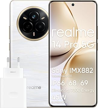 realme 14 Pro 5G Smartphone, 12 + 512GB, Cellulare, Design che Cambia Colore Sensibile al Freddo, IP69, 50 MP Sony IMX882 OIS Fotocamera, Display 120Hz, Batteria da 5260 mAh, Bianco(Con Adattatore)