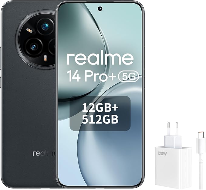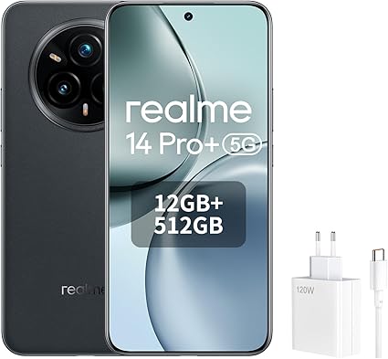 Il realme 14 Pro+ 5G in Suede Grey offre prestazioni di fascia alta con 12 GB di RAM, 512 GB di memoria, un display OLED da 120 Hz, una fotocamera da 50 MP con OIS e una batteria da 6000 mAh per un uso quotidiano.