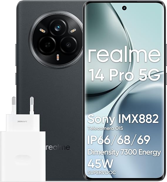 realme 14 Pro 5G Smartphone, 12 + 512GB, Cellulare, Chipset Dimensity 7300 Energy 5G, IP69, 50 MP Sony IMX882 OIS Fotocamera, Display 120Hz, Batteria da 5260 mAh, Grigio(Con Adattatore)